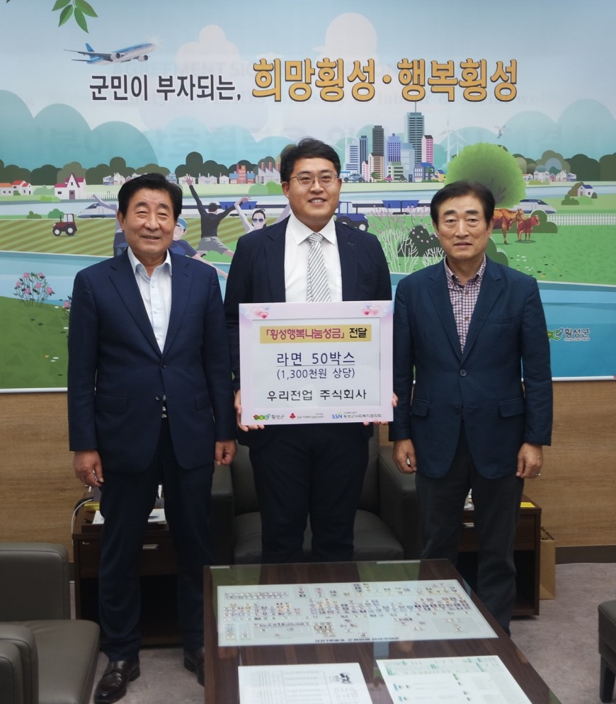 【주)우리전업】에서 『횡성행복나눔성금』으로 성품을 기탁해주셨습니다. 소중한 후원 진심으로 감사합니다.