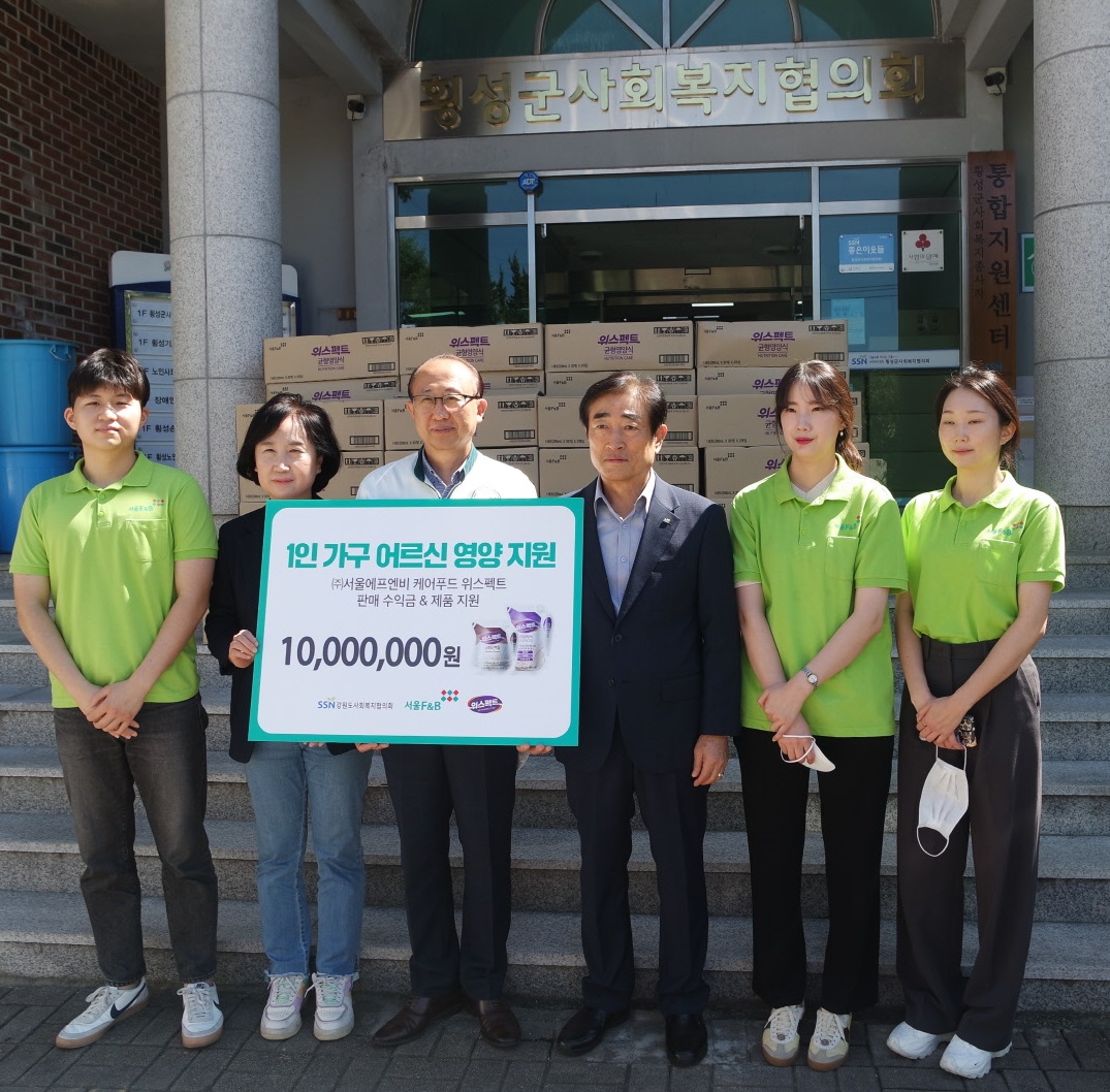 서울F&B는 추석명절을 맞아 관내 독거어르신들의 건강을 챙겨드리기 위해 영양음료를 기탁해주셨으며 전달식에는 김진홍 전무이사님과 직원분이 참석하셨습니다. 서울F&B에서 기탁한 위스팩트 영양음료(약10,000,000원 상당)는 추석을 맞아 횡성관내 소외계층 독거어르신에게 전달될 예정입니다. 소중한 후원 진심으로 감사합니다.