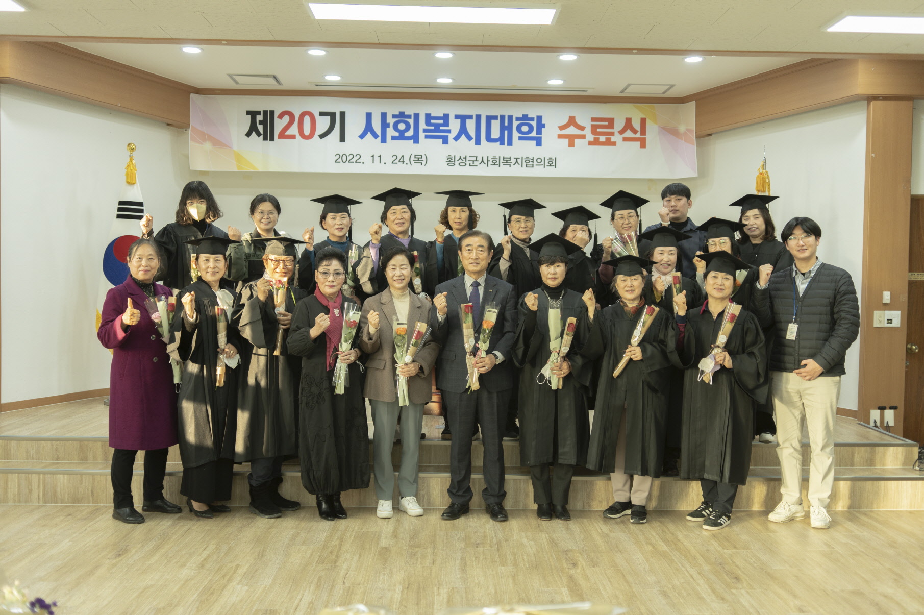 횡성군사회복지협의회(회장 이석원)는 11월 24일(목) 사회복지협의회 2층 대강당에서 제20기 횡성사회복지대학 수료식을 진행하였습니다. 이날 행사는 횡성군청 김명기 군수님, 이지유 과장님(복지정책과)을 비롯한 수강생 30여명이 참석한 가운데 진행되었습니다.
