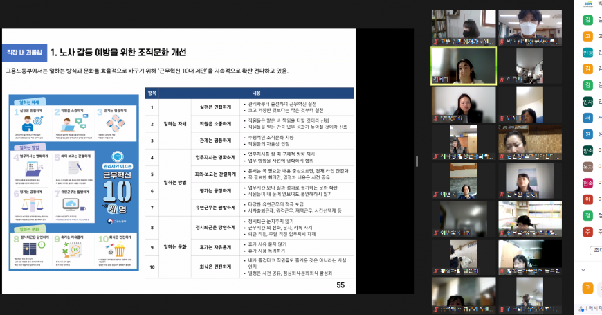 횡성군 사회복지시설, 기관, 단체장 및 중간관리자 20여분이 참석해주셨고, 사회복지현장에서 발생되고 있는 직장내 괴롭힘, 노사갈등에 대한 사례들을 살펴보고 예방 및 대처할 수 있는 교육을 통하여 시설 내 안전한 조직문화를 구축할 수 있는 교육을 진행하였습니다.